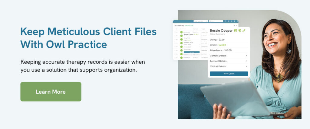 The importance of accurate documentation also extends to efficiency. Unfortunately, many therapists spend too much time on recordkeeping, review, and other non-client-focused tasks. Organization makes it easier to look through and store things quickly, giving you more time to spend with clients.