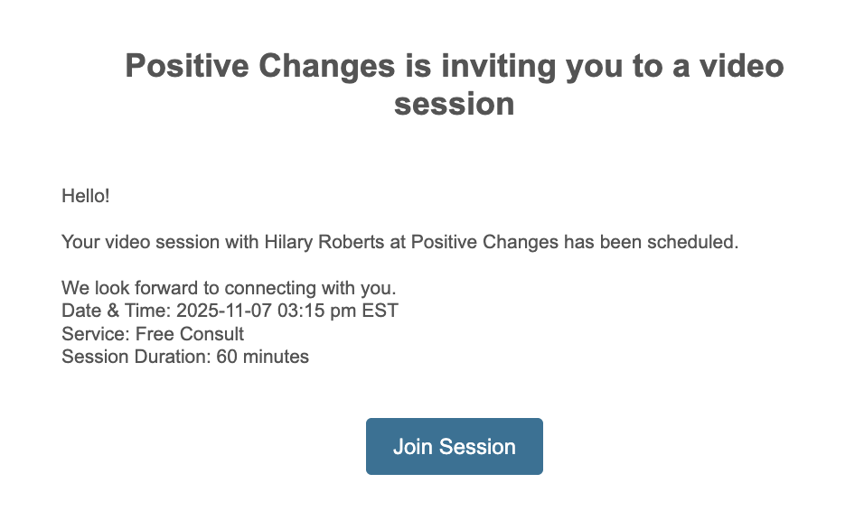 Clients can easily join video sessions directly from reminder emails — no portal login required, just a simple few clicks to connect.