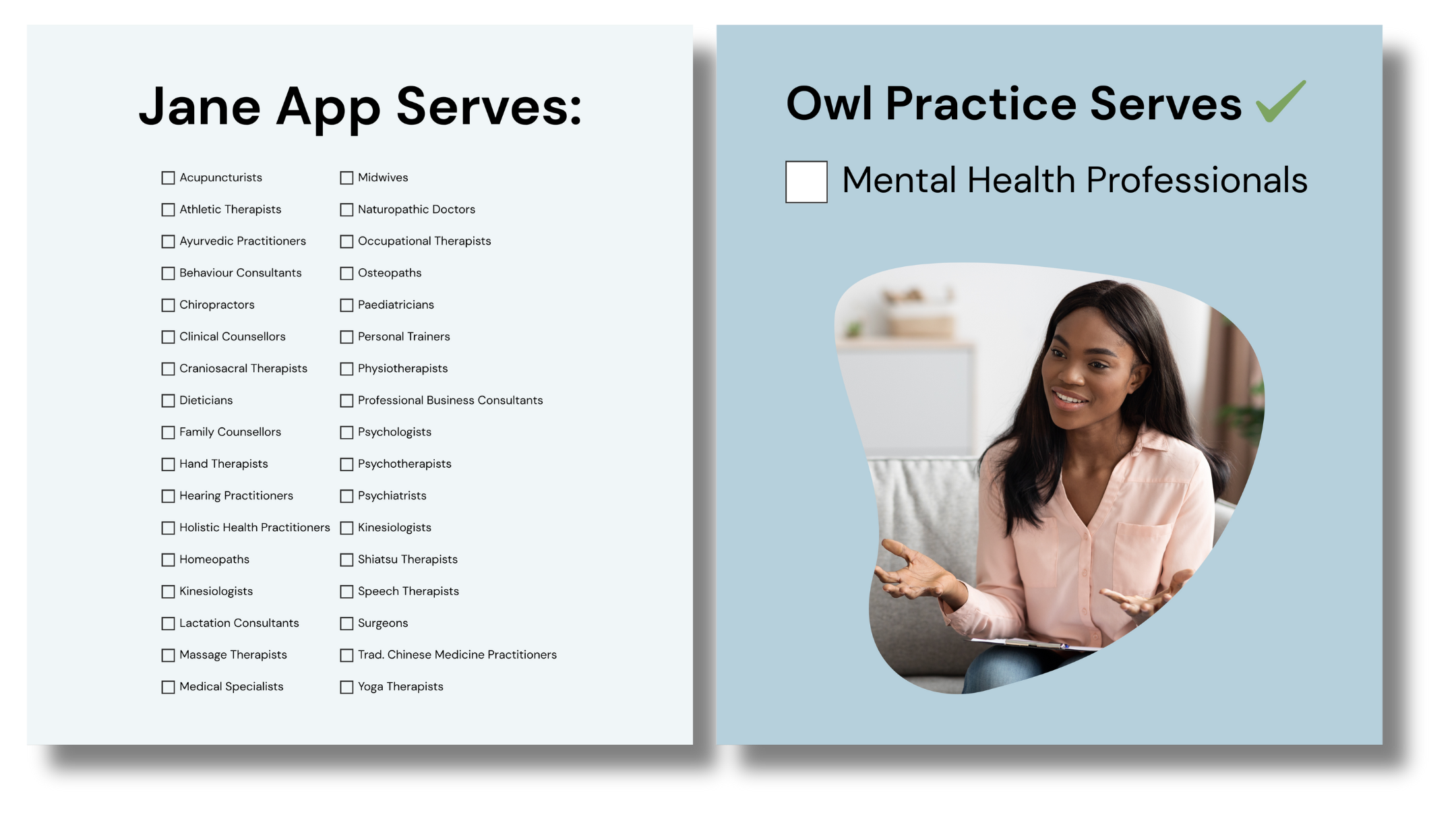 Jane App serves physiotherapists, chiropractors, massage therapists, and dozens of other health professionals. Owl Practice was built exclusively for mental health — and that makes all the difference.